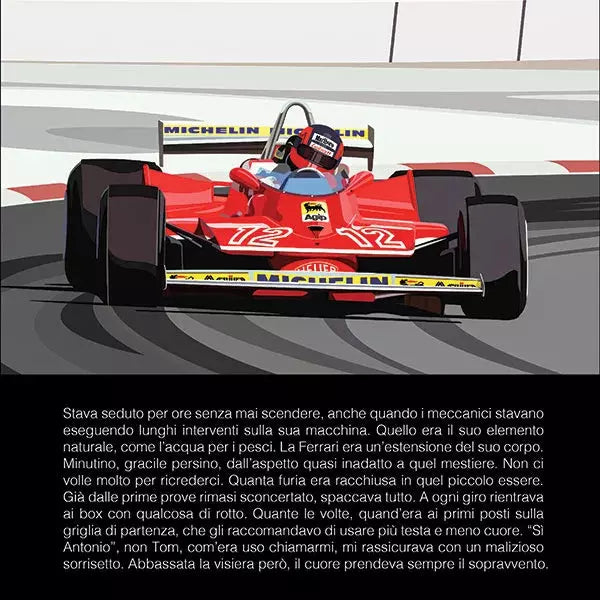 “Stava seduto per ore senza mai scendere, anche quando i meccanici stavano eseguendo lunghi interventi sulla sua macchina. Quello era il suo elemento naturale, come l’acqua per i pesci. La Ferrari era un estensione del suo corpo. Minutino, gracile persino, dall’aspetto quasi inadatto a quel mestiere. Non ci volle molto per ricrederci. Quanta furia era racchiusa in quel piccolo essere. Già dalle prime prove rimasi sconcertato, spaccava tutto. A ogni giro rientrava ai box con qualcosa di rotto. Quante le volte, quand’era ai primi posti sulla griglia di partenza, che gli raccomandavo di usare più testa e meno cuore. “Si Antonio“, non Tom, com’era uso chiamarmi, mi rassicurava con un malizioso sorrisetto. Abbassata la visiera però, il cuore prendeva sempre il sopravvento”.